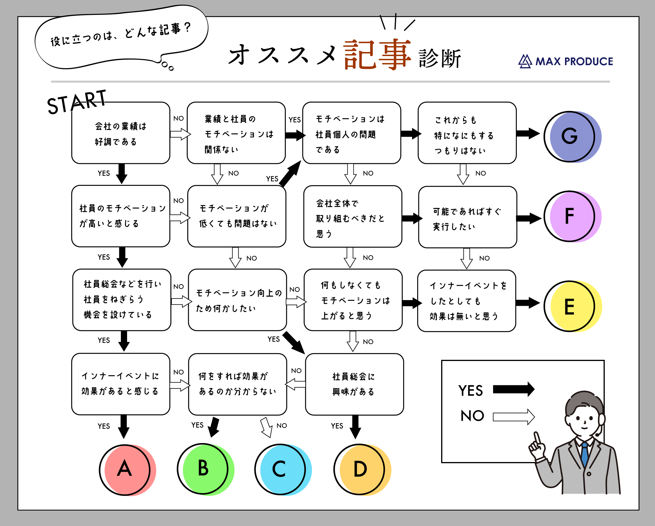 今回の診断チャートでは、会社の業績と社員のモチベーションをあげるために必要な解決策とオススメ記事をお教えします!