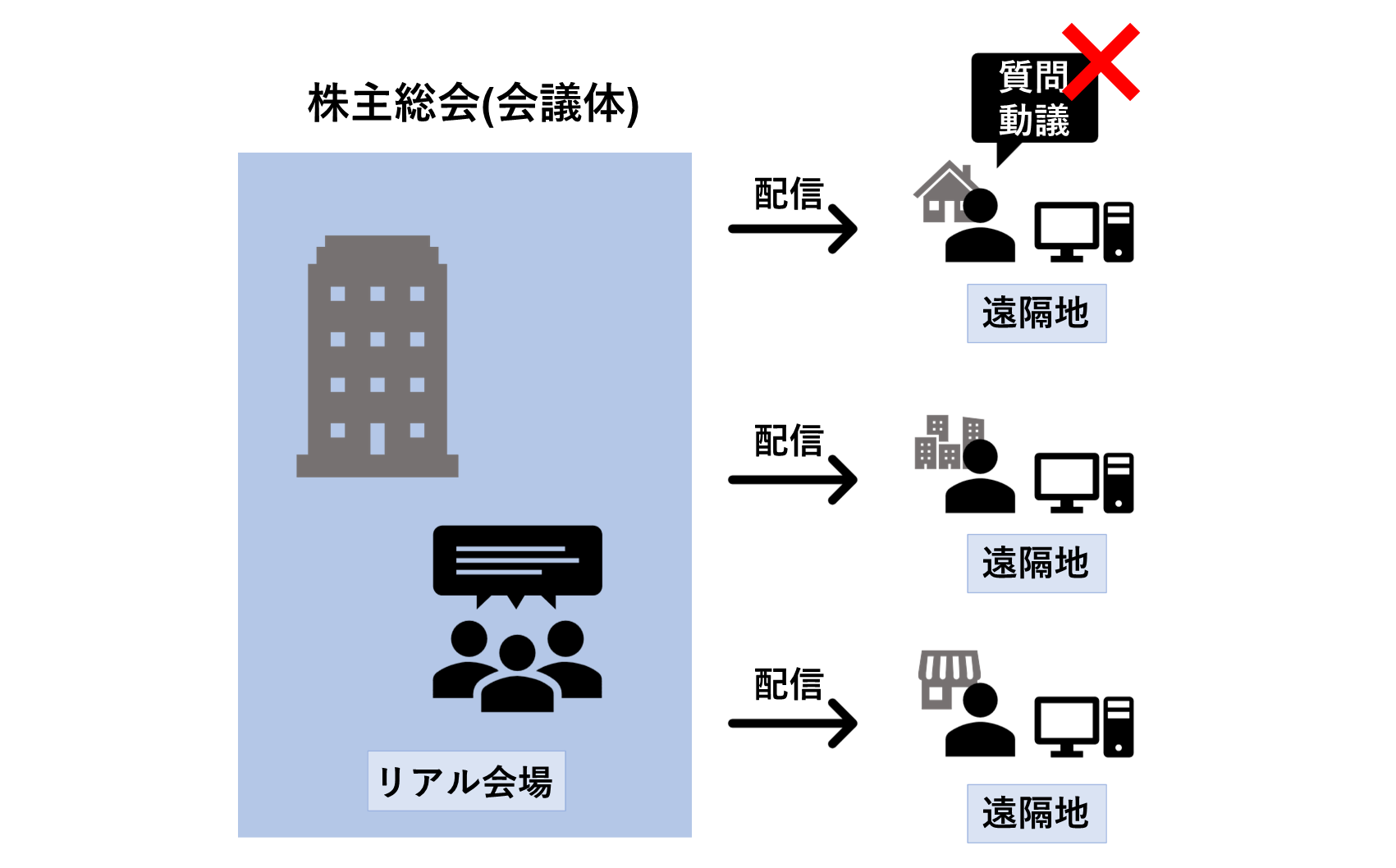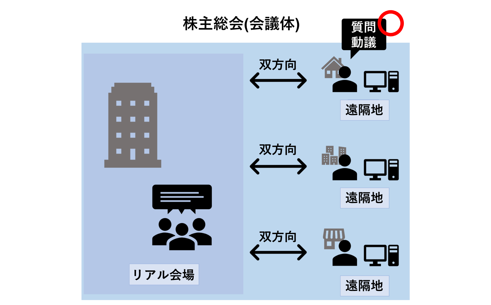 ハイブリッド出席型バーチャル株主総会は、株主総会が実際に行われている会場と、株主との間で、音声や映像といった情報伝達の双方向性と即時性が確保されていることが前提となります。