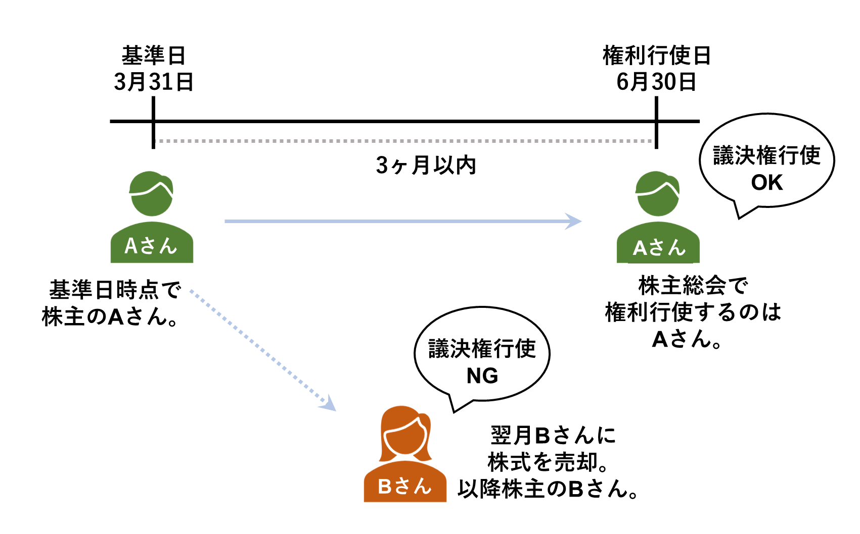 この基準日株主が行使することが出来る権利は「基準日から三か月以内」と会社法により定めれていて、日本の企業では、毎年3月末を事業年度の終了日としているケースが多いので、多くの場合基準日も3月末となります。